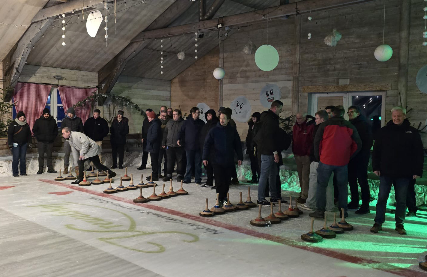 Der Nachmittag begann vor der Scheune des Krewelshofs, wo bereits die Eisstockbahnen vorbereitet waren. Bei Glühwein und Punsch stimmten wir uns auf das gemeinsame Programm ein, bevor es in gemischten Teams auf vier Bahnen losging. Der sportliche Wettbewerb stand dabei bewusst nicht im Vordergrund. Vielmehr ging es um Teamgeist, gemeinsames Erleben und den Austausch abseits des Arbeitsalltags. Kleine Ausrutscher auf dem Eis blieben glücklicherweise folgenlos und sorgten eher für gute Stimmung als für Verletzungen.